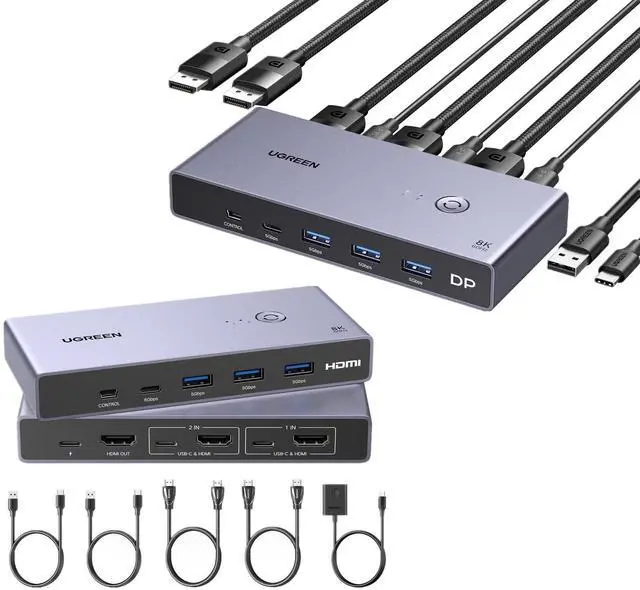 UGREEN 8K@60Hz HDMI KVM Switch with 4 USB 3.0 Ports Bundle with 8K Displayport KVM Switch DP 1.4