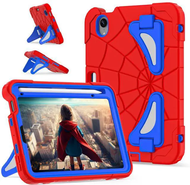 Kids Case for iPad mini 7 A17 Pro 2024/ Mini 6 8.3 inch, Spider Case for iPad mini 7th 6th Generation, Shockproof Durable Full Protective Cover with Pencil Holder, Kickstand (Red+Blue)