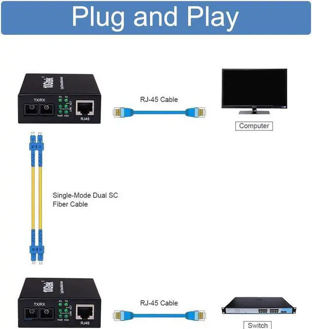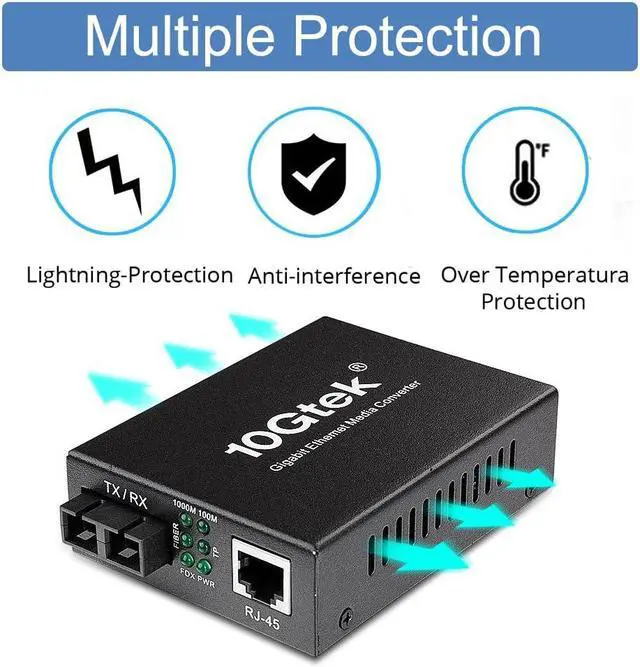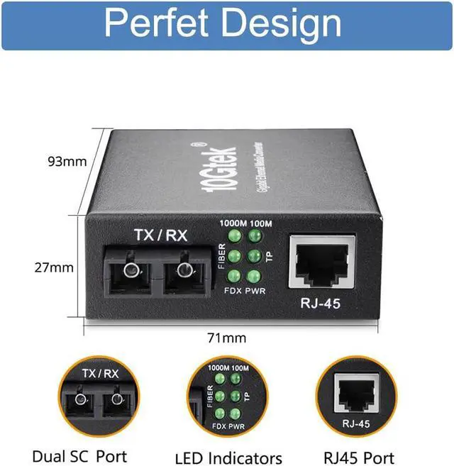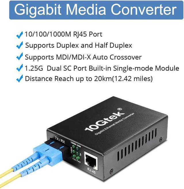 Main Features: Complies with IEEE 802.3, IEEE 802.3 u, IEEE 802.3 z, IEEE 802.3 ab, IEEE 802.3 x Auto negotiation function allows UTP port to auto select 10M, 100M or 1000M Ethernet port supports MDI/MDI-X auto crossover Extends distances up to 20km (single mode fiber) Auto MDI/MDI-X support on RJ-45 port Support Full Duplex and Half Duplex Status LED's for TX, FX LINK/ACT, POWER, FDX to easily monitor network status 1Mbit RAM for data buffer Supports jumbo frame size 9K bytes