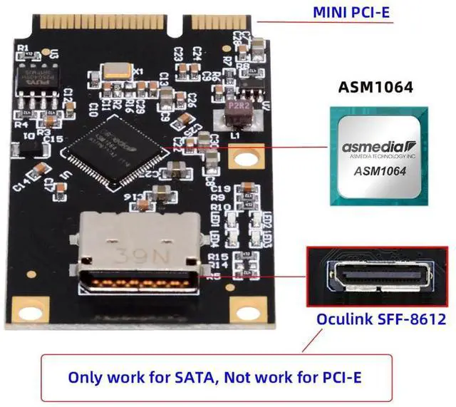 Main control chip: ASMedia ASM1064.Interface: Oculink SFF-8612.Applicable slot: MINI PCI-E (mSATA is not supported)