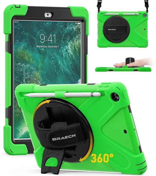 BRAECN for iPad 6th/ 5th Generation Case, Protective Shock-Proof Silicone Case with Built-in Pencil Holder, 360 Degree Rotating Stand/Handle Strap, Shoulder Strap for iPad 9.7 Inch 2018 Model-Green