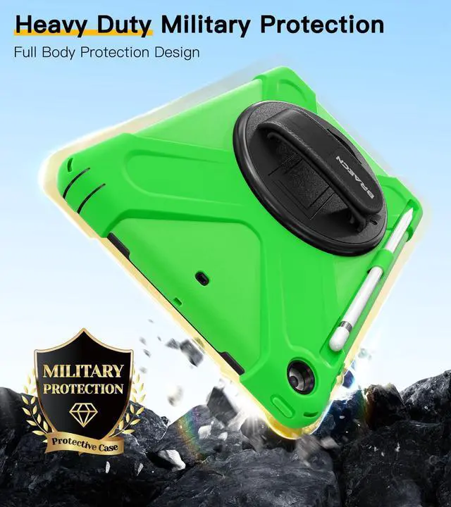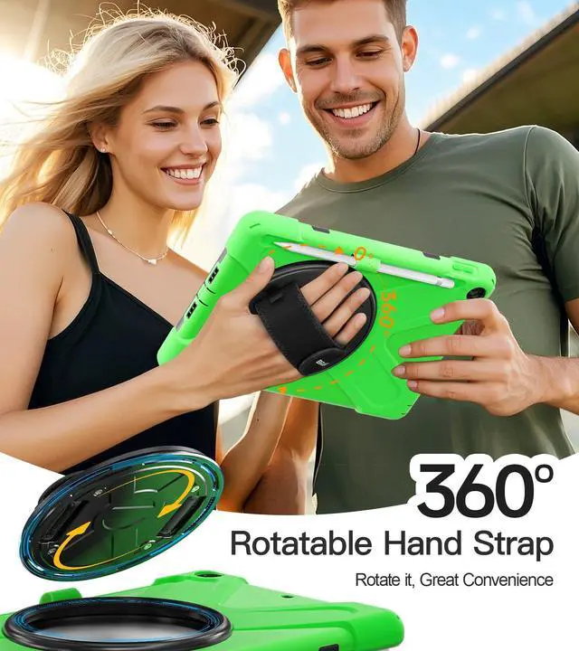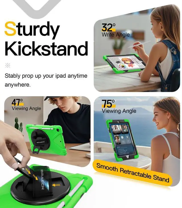 360° Swiveling Stand & Hand StrapLocated on the back of apple iPad 6th/5th generation 9.7 inch case 2018/2017, built-in 360 degree rotating kickstand and adjustable handle hand strap provides a more flexible and convenient way to use your tablet during work, study or journey, ideal for students,teachers,engineers,cashiers and waiters,etc.