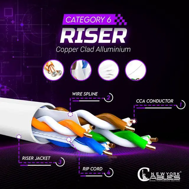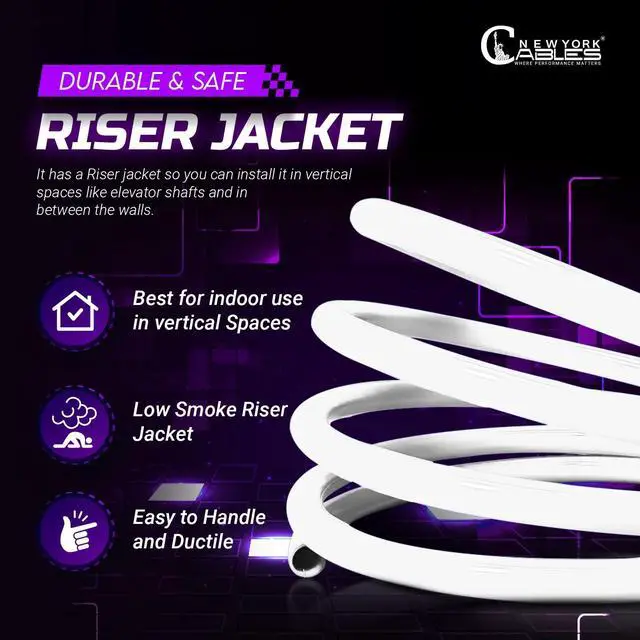 • DURABLE RISER JACKET: Featuring a sturdy riser jacket, this 1000 ft Cat 6 cable is fire-retardant and designed for vertical riser applications between floors. Built to protect internal conductors and maintain performance, this C