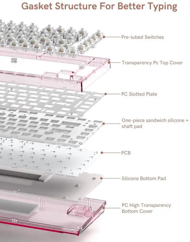 Gasket Mounted Wireless Mechanical KeyboardAs to give a better Gasket typing experience, in addition to the silicone gaskets on the plates, the X75 creamy keyboard adds sandwich silicone sound dampeners to the plate and fully-fitted large bottom silicone pad between the top and bottom cases. This design significantly reduces the gap between the PCBA and bottom case, avoids the noise of the impacted metals, maintains the flexibility of the gasket structure, and improves the overall typing sound.