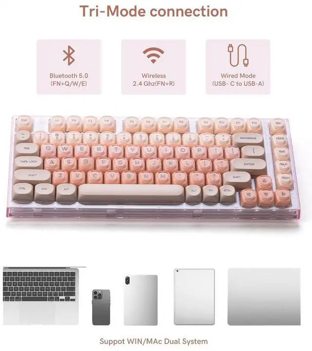 Multi-Device and Tri-Mode Wireless Connectivity: BT5.0&2.4G&Type-C CableEquipped with a 4000mAh capacity battery, X75 wireless keyboard support Bluetooth, 2.4G wireless and wired connection. Compatible with Laptop, iPad, IOS, Windows, Mac or Android. No fussy connection process, the wireless connection is quick and stable. 2.4G wireless receiver and wired cable are included.