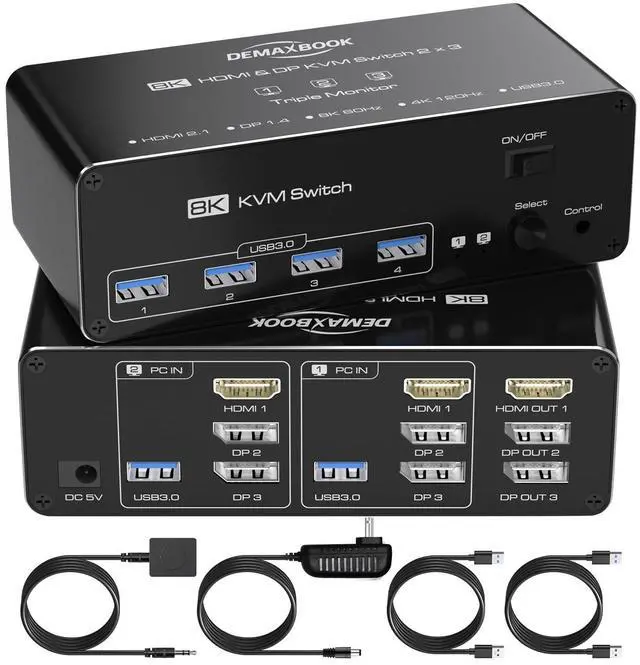 Triple Monitor KVM Switch for 2 ComputersThe DEMEXBOOK KVM Switch allows you to control 2 computers using one keyboard, mouse, and 3 monitors. Supports extended and duplicate display modes. Note: Each computer must have 2 DP ports and 1 HDMI port for compatibility. Perfect for multitasking, gaming, and productivity.