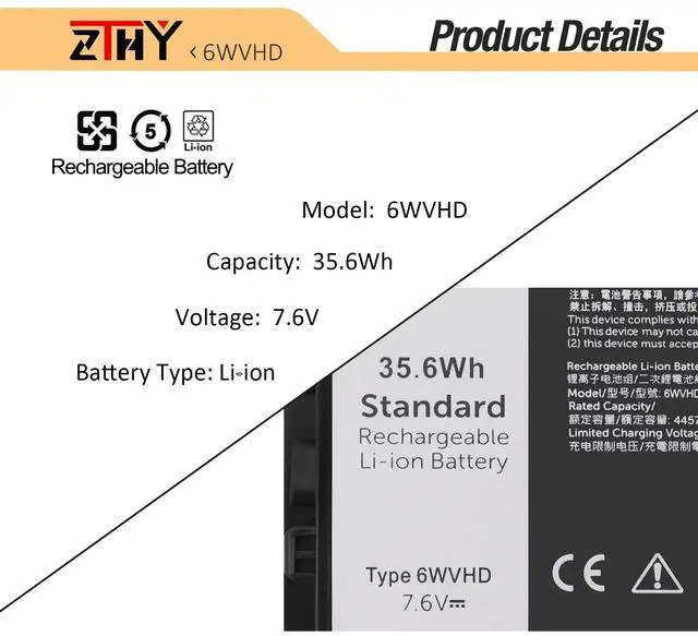 ZTHY 6WVHD Laptop Battery Replacement for Dell Latitude 7230 Rugged Extreme Tablet Series T06H T06H001 FNW8F JM6CX VDDJY 0VDDJY0 451-BDDY 7.6V 35.6W h 4457mAh