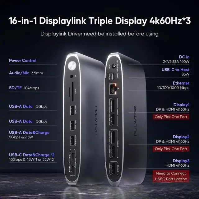 UPGRADED 16-in-1 DISPLAYLINK DOCKING STATIONDisplayLink Docking Station 3 Monitor 16 ports: 3*4K HDMI, 2*4K DisplayPort, 2*10Gbps & 45W USB-C ports,1*5Gbps Data & BC 1.2 Charging, 2*5Gbps USB-A ports, 1000Mbps Gigabit Ethernet, Audio, TF/SD and a DC-in power supply port. Laptop dock allows to expand your laptop's display up to 3 monitors, connect various peripherals, and charge your devices.
