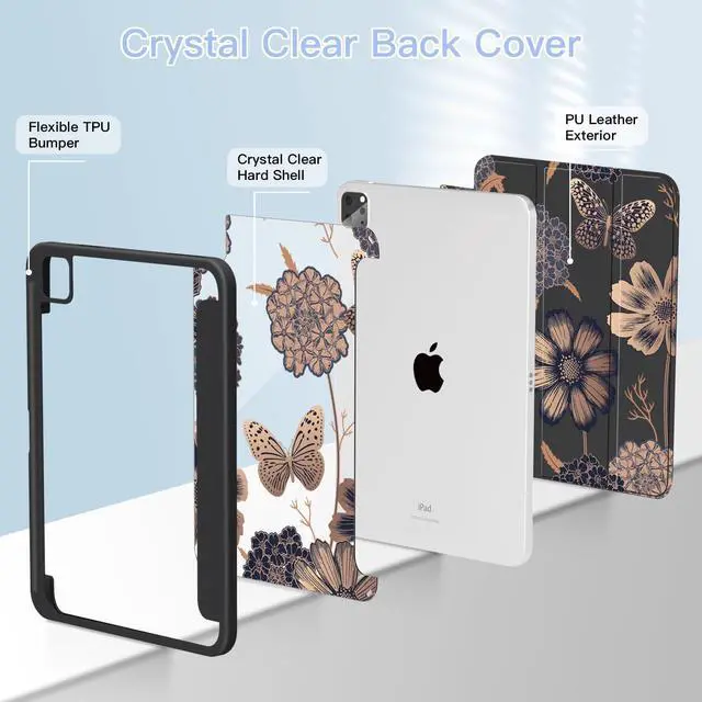Teryeefi for iPad Air 11 Inch Case M2 M3, iPad Air 5th / Air 4th Generation 10.9 Inch, iPad Pro 11 4th/3rd/2nd/1st Gen - Clear Back Cover with Pencil Holder Auto Wake/Sleep (Butterfly Flowers)