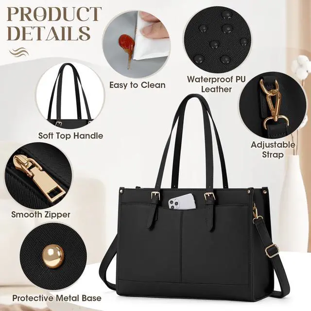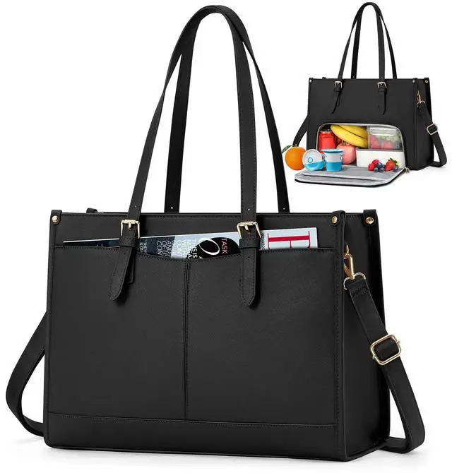 Multi-Pocket laptop Bag for Women: This women's laptop tote Bag features a separate, padded laptop compartment that up to 15.6 inches accommodate computer.The main compartment includes a separate laptop compartment, an iPad pocket, two slip pockets, two pen holders, a zippered pocket, a keychain, two side mesh pockets for water bottles, a front zippered pocket, and a back slip pocket.This laptop lunch bag keeps your belongings organized and easy to find.