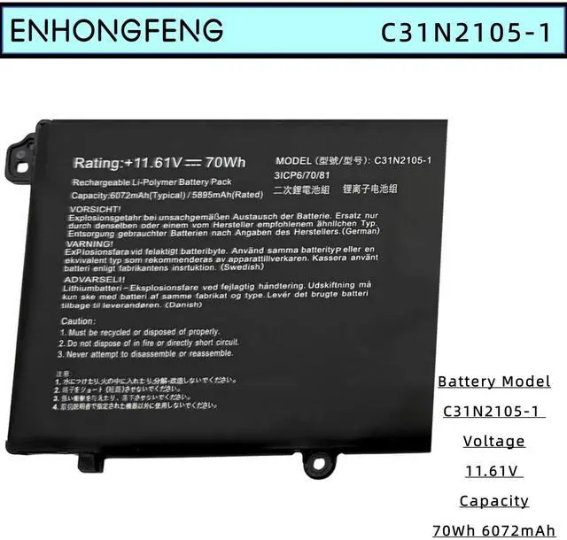 • Battery Model: C31N2105-1 ; Voltage: 11.61V ; Capacity: 70Wh 6072mAh