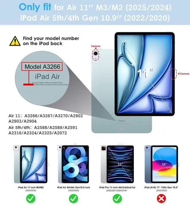 Specifically designed for the Apple iPad Air 11 inch 7th/6th Generation tablet M3/M2 2025/2024(Model Number: A2902/A2903/A2904), aslo fit iPad Air 5th/4th generation 10.9 inch tablet 2022/2020(Model Number: A2588/A2589/A2591/A2316/A2324/A2325/A2072).Also fit Apple iPad Pro 11 inch 4th/3rd/2nd/1st 2022 & 2021 & 2020 & 2018 Tablet(Model Number: A2759/A2435/A2761/A2762/A2377/A2459/A2301/A2228/A2068/A2230/A1980/A2013/A1934). Not compatible with any other iPad model