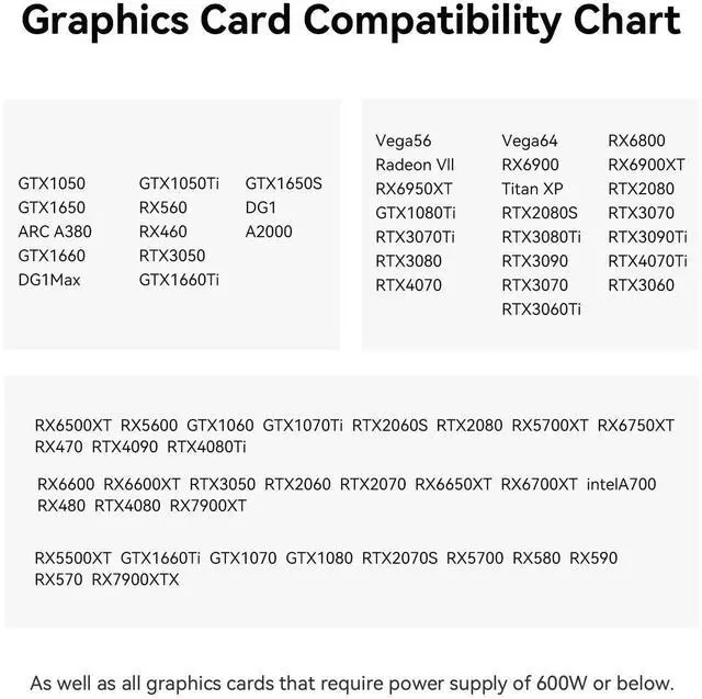 Compatible with Beelink GTiBeelink Ex docking station works with GTi Ultra Series Beelink PC(GTi14>i12) and graphics cards to meet various high-speed graphics needs. Support NVIDIA(including RTX 30 Series)/AMD(including RX 6000 Series) GPU. As well as all graphics cards that require power supply of 600W or below.