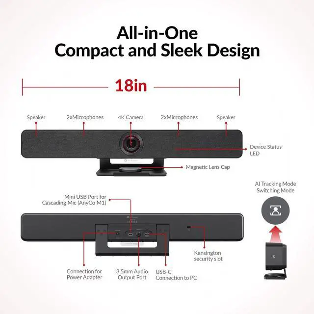 WIDE ANGLE CAMERA: Anyco V8 will bring you to the new era of Ultra HD conference experience. Splendent camera optics with 120 wide angle lens and true-to-life 4K image quality make you feel like youre sitting face-to-face with the far-end attendees. ^^ COMMUNICATE MORE EFFICIENTLY, BUILT-IN