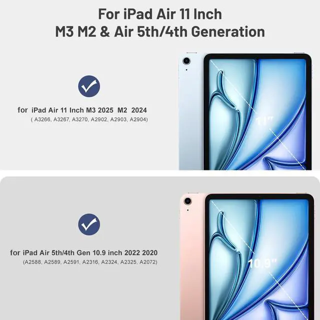 Air 11-inch 10.9 -inch: Case for iPad Air 7th gen M3 2025 (A3266, A3267, A3270); Case for iPad Air 6th gen M2 2024 (A2902, A2903, A2904); Case for iPad Air 5th gen 2022 (A2588, A2589, A2591); Case for iPad Air 4th gen 2020 (A2316, A2324, A2325, A2072).