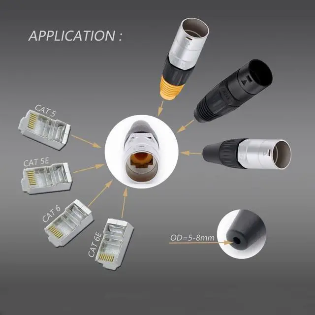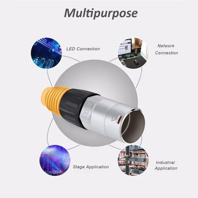 RJ45 Ethernet connectorMulti-purpose design RJ45 for a wide range of application needs. With strong applicability and complete electromagnetic and radio frequency interference protection. it can be Used to the home network, industrial network, stage credit connection, outdoor Ethernet LAN cable, LED equipment, underground engineering, communication field, etc. ^^ EASY TO INSTALLPush-pull design with secure locking system and optional installation of straight or PCB adapter. No soldering, no installation tools, just stop up standard crystal head directly for quick installation. Be compatible with the prevailing 8P8C RJ45 plug, be equipped with a waterproof cap, which protects the connector from external harm.