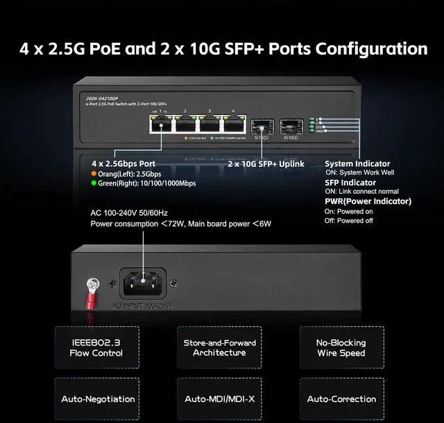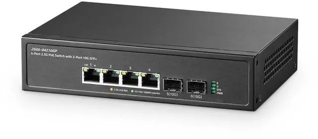 2.5G Ports 4 x 2.5Gigabit ethernet Ports, 2500Mbps/1000Mbps/100Mbps rate auto-adaptive. 2x 10G SFP+ Slot(compatible 1G/2.5G Module, not include SFP Module). 60Gbps backplane bandwidth, excellent data forwarding performance