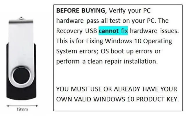 Recovery & Repair Installation USB, can be used on Win 10 PC ^^ Win 10 Bootable USB. Insert this USB. Boot the PC. Then set the USB drive to boot first to repair, recover, or reinstall Win 10.. Does Not Include A KEY CODE, LICENSE OR A COA. Use your product KEY to preform the REINSTALLATION option
