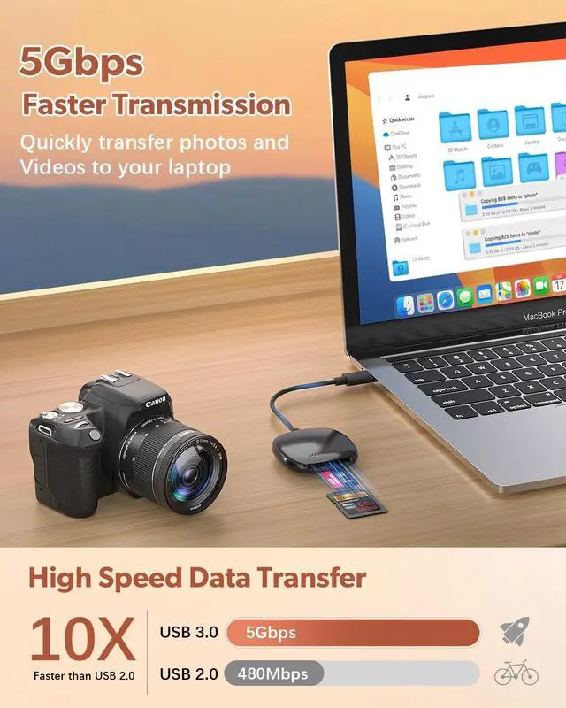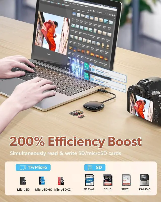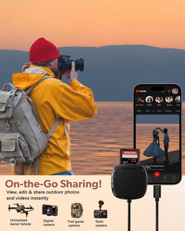 This sd card adapter usb c adopts dual card slot design, compatible with SD/SDHC/SDXC/MicroSD/MicroSDXC/MicroSDHC memory cards. You can easily save the photos inside the SD card to your iPhone/iPad/Mac/Camera, view the photos and videos in the memory card anytime and anywhere, and upload them to social platforms, it is a good partner for your travelling and playing.
