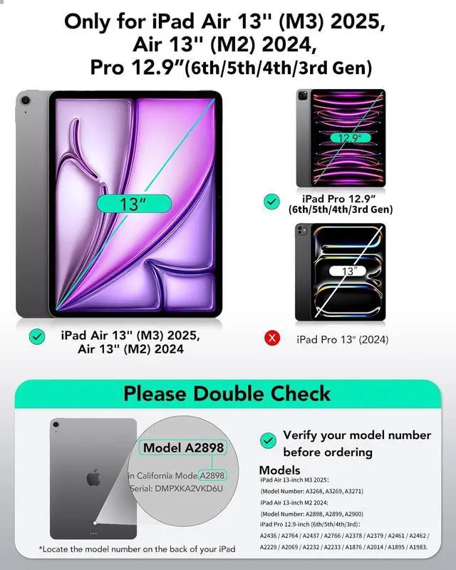 Compatibility Model: Specially designed for iPad Air 13 inch M3/M2 (2025/2024) & iPad pro 12.9 inch (6th/5rd/4th/3rd gen 2022/2021/2020/2018), only compatible with models A2898, A2899, A2900, A2436, A2764, A2437, A2766, A2378, A2461, A2379, A2462, A2229, A2069, A2232, A2233, A1876, A2014, A1895, A1983; Not compatible with iPad pro 13 inch M4 2024, It is also not compatible with any other iPad models; Please check the bottom back of your iPad to find the model number. ^^ Removable Sliding