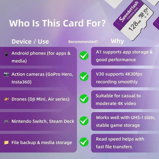 ^^ Versatile Storage Options: Available in capacities from 32GB to 512GB, to diverse storage needs, from HD photos and videos to game data and apps. For instance, the 128GB model can store up to 6 hours of 4K video, 20 hours of 1080P video, 37, 600 photos, or 19, 440 songs. ^^ Works with