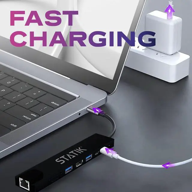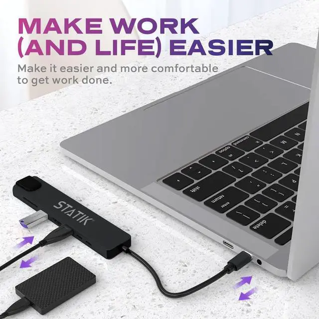 With our USB C hub multiport adapter, you get a combo of power and utility that's hard to match. The built-in USB-C hub USB splitter provides high-speed connections for all your devices, and the powered capability means you can charge your devices while working ^^ - The Statik UltraHub does not just stop at being a comprehensive USB dock, it goes beyond. This USB C dongle also doubles as an iPad Air stand and a MacBook Air docking station dual monitor, ensuring you are always ready for any task. Whether you need to present a business proposal or enjoy a movie, this hub has got you covered.