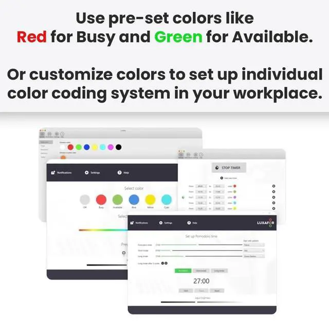 Meet 2nd Generation Luxafor Bluetooth PRO wireless busy light Intuitive use, simple to install, and highly customizable. Functions on Windows, Mac and Android. ^^ UNDERSTOOD BY EVERYONE Use pre-set colors like Red for Busy and Green for Available, or customize colors to set up individual color coding system in your workplace. ^^ WORK WITHOUT DISTRACTIONS Remove distractions and improve attention by displaying real-time availability at the speed of light. ^^ PROMOTE DEEP WORK Enhance deep work by setting up smart schedule and integrating Luxafor Bluetooth PRO with your favorite tools to build a productive environment.