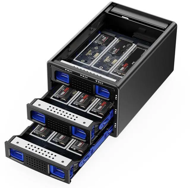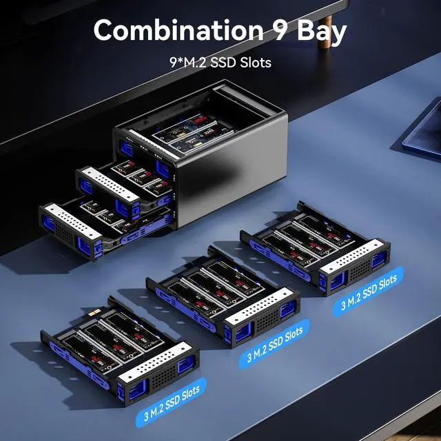 Ultra-High-Capacity NVMe Hard Drive EnclosureThe first hard drive enclosure capable of simultaneously accommodating 9 NVMe hard drives. The Hard Drive Enclosure can hold 6 M. 2 2230/42/60/80/110 NVMe SSDs. Maximum capacity of 8TB per M. 2 SSD. Expanding the capacity for users by a maximum of 72TB (Max 9*8TB), read and write all 6 of your NVMe drives simultaneously! ^^ Up to 10GbpsUtilizes an advanced chip solution set and USB 3.2 Gen 2 protocols, full load read rate at 200-600MB/S. ^^ No heatThis NVMe enclosure built in Aluminum-Alloy materials and 2.7 inch Silent Fans.