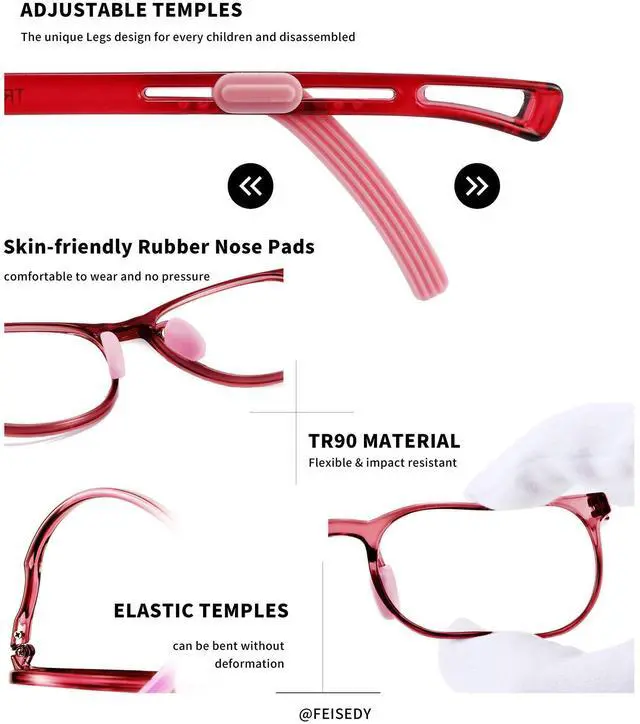FEISEDY Unique Design, Made by Soft Skin-friendly TR Material and High-quality polycarbonate, Completely Flexible and Virtually Unbreakable Safe for Kids. At the same time, This Adjustable Legs Design can fully adapt to different head circumference of children, this is an excellent design. FEISEDY provide comfortable glasses frame for children's healthy growth. ^^ Blue Light Blocking Glasses (Non-prescription) for Kids daily digital use, as using computer, iPad or smart phone. Not only protect kids sight but also considerably reduce headaches and migraines caused by fatigue. FEISEDY Lens can also effectively prevent UV glare, ensuring UV400 protection, against the sun and powerful screens.