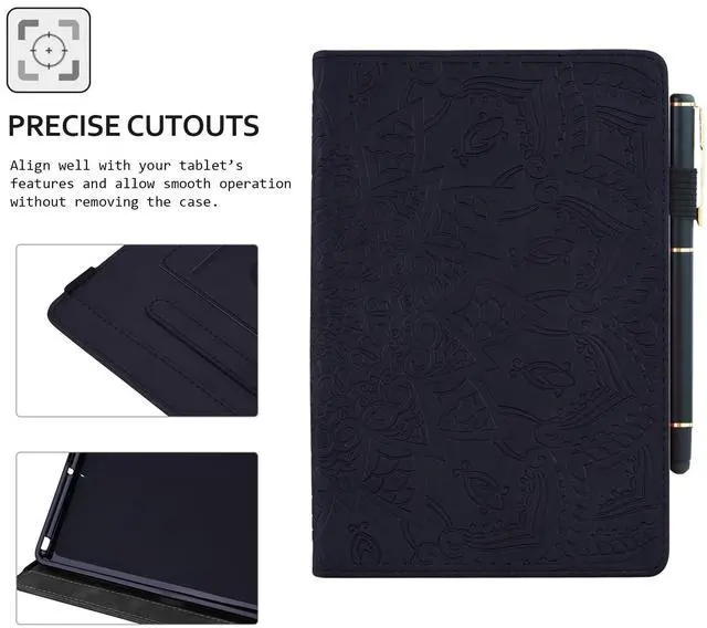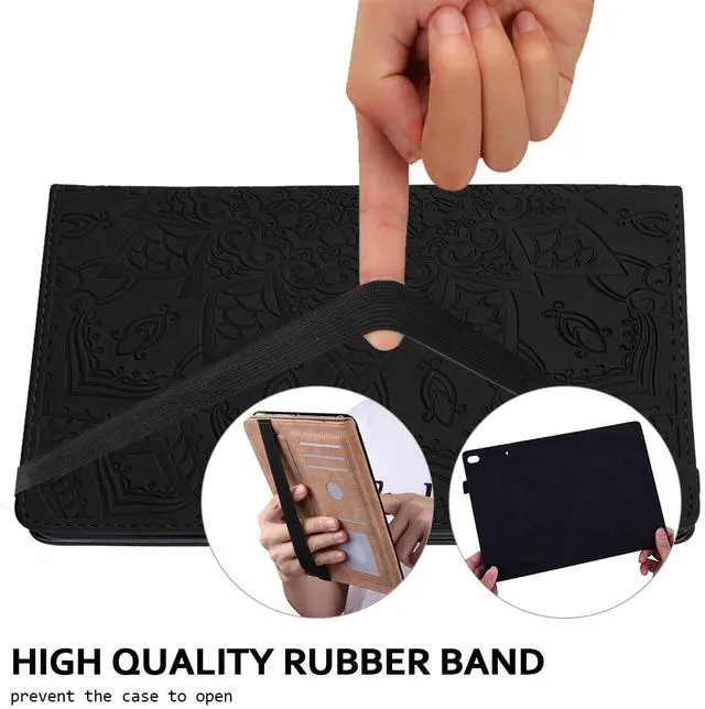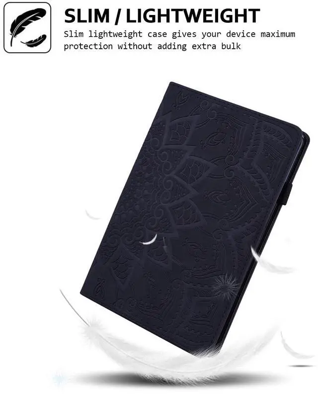 Features: Pretty mandala flower embossed surface, offers exquisite and attractive look for your tablet. Easy access to all features and controls (camera, charging port, volume button, etc) without removing the case. Elastic strap closure ensures cover securely closed, double fixing your device when fold the front cover backward for reading. Front-to-back protective cover case give a full protection for your tablet against dust, water, fingerprints, scratches, shocks and bumps. Interior with 2 card holders for carrying your ID/ credit cards/ business cards/ photos. Side with an elastic loop holder for stylus.