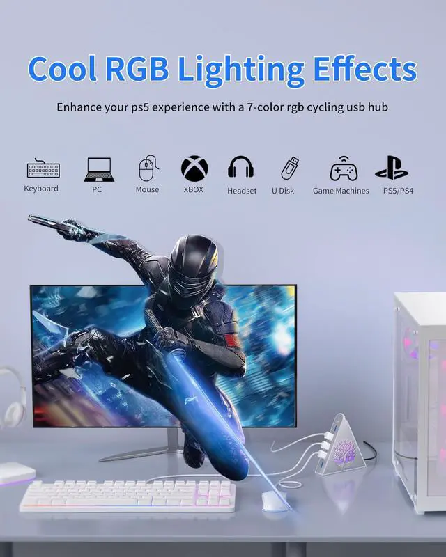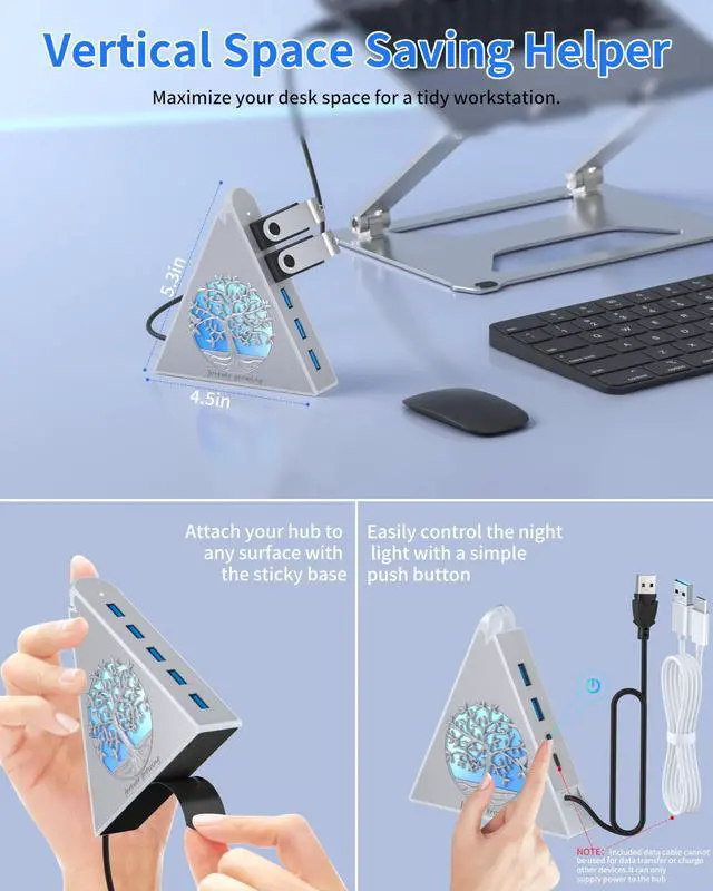 Whether youre backing up work files, moving 4K videos, or syncing photos, this USB port hub for PC ensures reliable and efficient performance across all your devices. ^^ Stylish RGB Tree Lighting DesignAdd a calming, modern touch to your workspace or gaming station with this gaming USB hub featuring RGB lighting and a unique tree silhouette. The soft lighting cycles through seven vibrant colors and can be turned off with a simple button press. Ideal for users looking to blend function with desktop aesthetics, especially in setups that need a USB hub for desktop or laptop use.