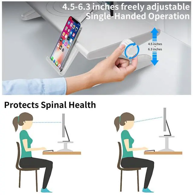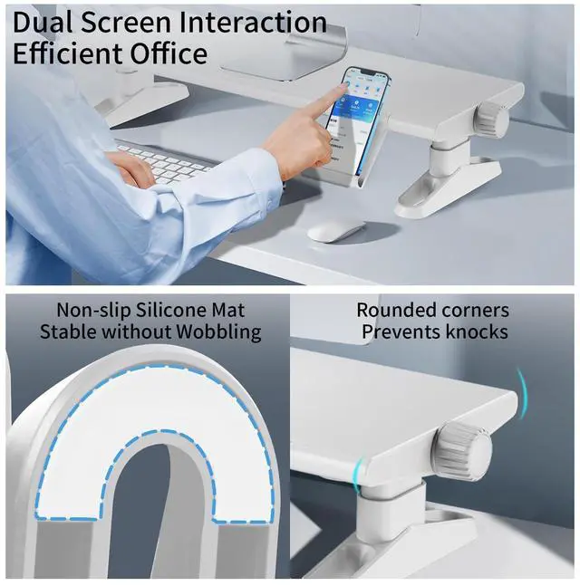 The compact and solid design and production make it very stable and does not shake at all. Not only suitable for monitors and laptops but also for speakers, printers, coffee machines, TV, etc... ^^ Comes with a hidden mobile phone holder for better work We thoughtfully designed a hidden mobile phone holder on the computer screen stand, so that you can use your computer and mobile phone for work and entertainment at the same time, saving you the trouble of rummaging for your mobile phone. You can easily retract the phone holder when not using it, keeping the computer stand for desktop monitor tidy.