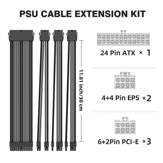 The kit includes: 1x24 PIN ATX Extension Cable (For Motherboard), 2x4+4 PIN EPS Cable (For CPU), 3x 8to 6+2 PIN PCI-E Cable (For GPU) ^^ 16AWG CABLESOur PSU extension cable uses 16AWG copper wire, which significantly increases the copper content, reduces resistance and power consumption, and solves the problem of power line heating caused by the use of high-power products ^^ CABLE COMBSThe set of white connector housing provides 4 pure white cable combs for each cable. The set of black connector housing provides 8 cable combs (4 clear+4 black) for each cable ^^ MULTIPLE COLORSSMEOZZ offers a variety of colors for you to choose from, allowing you to freely DIY your computer case and make it stand out from the crowd ^^ SALES SERVICEIf you have any questions or problems in your shopping, please contact us. Our team will provide you with the good service