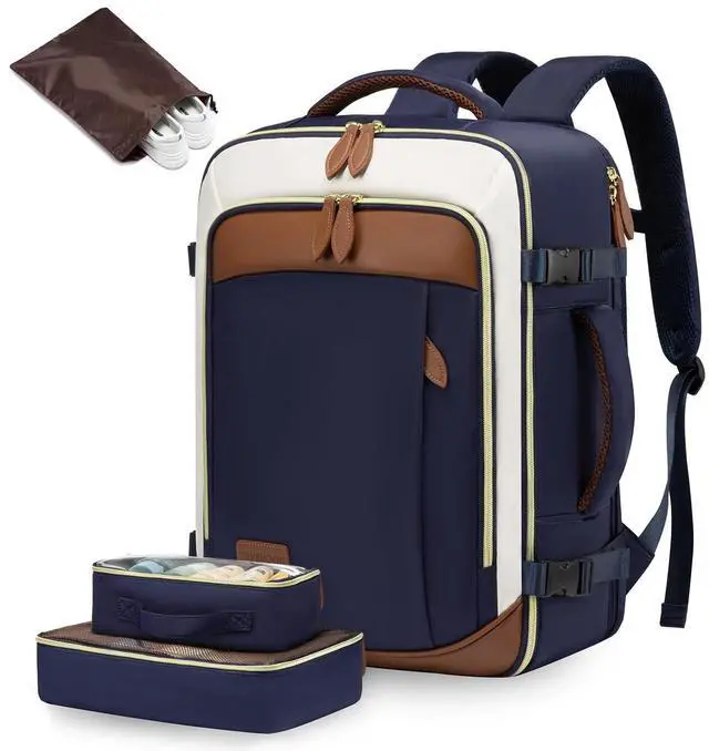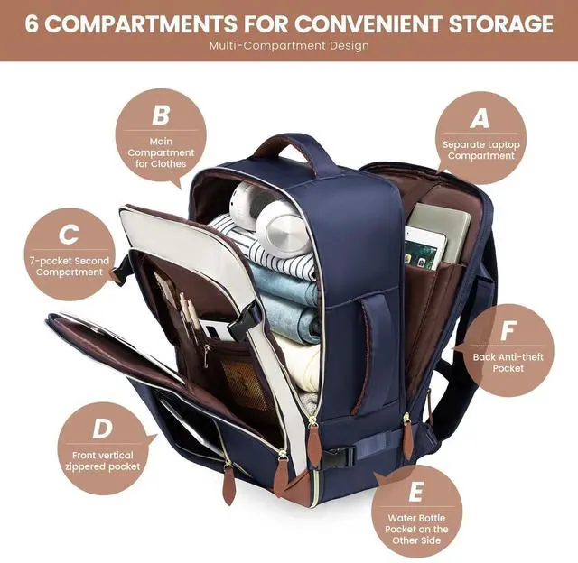 EXPANSIVE 50L CAPACITY FOR ORGANIZED TRAVEL - Journey with everything your travel essentials for 4-7days, neatly organized in this versatile carry on backpack. Its luggage-style main compartment, separate laptop section, and multi-pocket zipper front pocket offer unmatched convenience ^^ LIGHTWEIGHT YET RUGGED - Crafted from tear-resistant, water-resistant materials, this travel backpack for women weighs a mere 2.6 pounds. Complemented by exquisite craftsmanship and reinforced stress points. This backpack withstands the rigors of travel ^^ AIR TRAVEL MADE EFFORTLESS - Glide through airports with ease! This carry on bag, sized at 19.5 x14x9 inches, aligns with most airline carry on travel bag requirements.