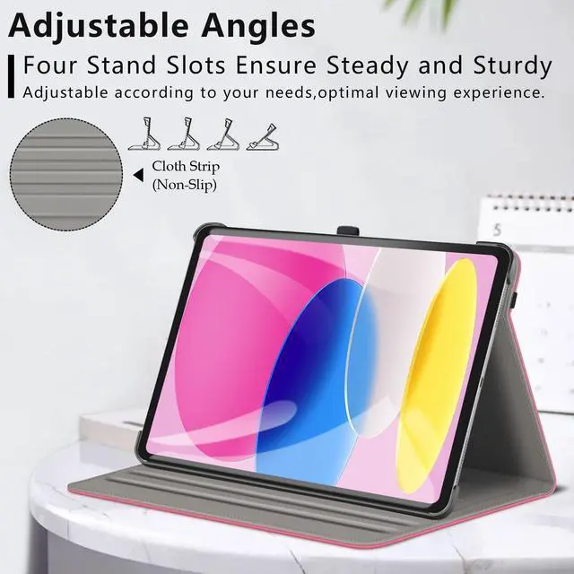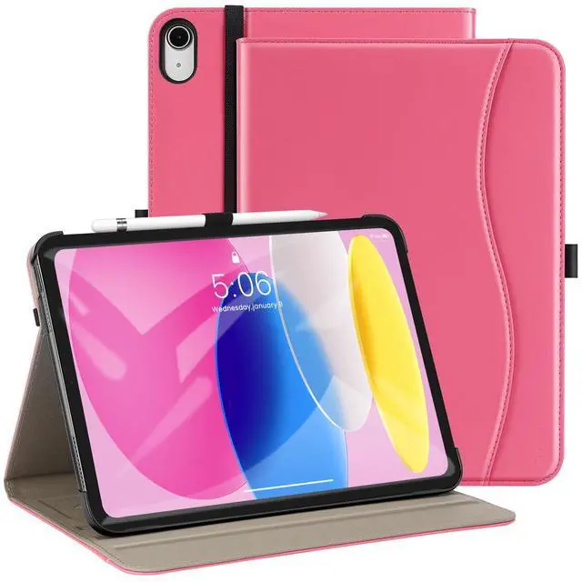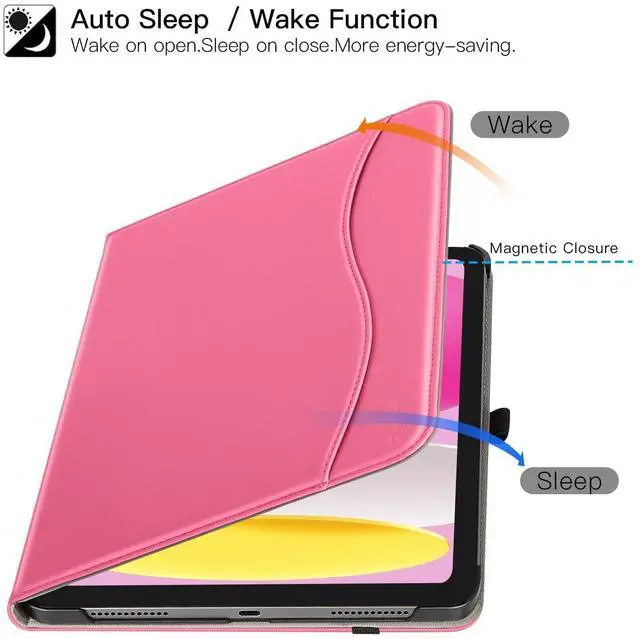 (Model Number: A2696/A2757/A2777) Not compatible with other iPad devices. Please check the model number of your iPad before purchasing. ^^ iPad 10th generation case with premium PU Leather exterior and anti-slip interior lining protects your iPad from shocks, drops and scratches. ^^ -The front cover is equipped with pockets for notes, cards, cash etc. External elastic band enhances magnetic closure. ^^ /Strong magnetic protective case makes it easy to wake or sleep your iPad, which can reduce battery drain for extending life. ^^ Multiple slots on the inside of the front cover can adjust your iPad to a comfortable viewing or typing angle, making you relax and entertain better. Full access to all controls and features without removing the case.