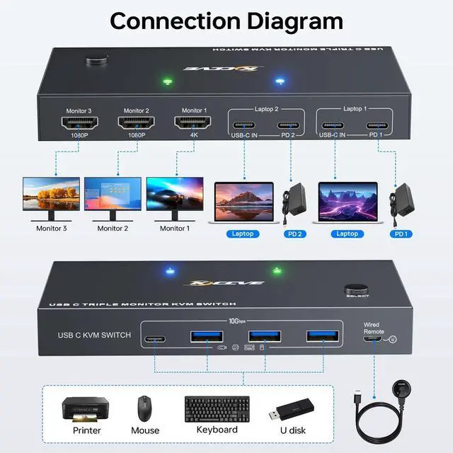 USB-C Docking KVM Switch 3 Monitors 2 LaptopsThe USB C 3 monitor KVM switch combines USB-C docking station and 3 monitors KVM switch, which not only does it expand your laptop into a workstation with 3 HDMI monitors, 4x USB 3.2 ports (3USB-A + 1USB-C), and 2*80W PD charging ports, but also allows to one-click switching between work and personal laptops. ^^ r The 3 monitors 2 computers KVM switch supports simultaneous output of 3 HDMI monitors, with resolutions of 1*4K@60Hz+2*1080P@60Hz.: After connecting your laptops to the USB C KVM switch, the laptop will automatically recognise the USB device and a pop-up window will appear, please follow the wizard to install the USB driver. This driver does not record any information, Only used for identifying monitors. ^^ Triple Monitor KVM Switch with 4 USB 3.2 PortThe 3 monitors KVM switch USB C docking station is euqipped with 4 USB 3.2 ports(3USB-A + 1USB-C) for connecting keyboard, mice, external hard drives and more. With a data transfer rate of up to 10Gbps, Backward compatibility with USB 1.1 / 2.0 / 3.0. ^^ Charge your laptops via KVM SwitchKVM switch 3 monitors 2 computers USB C features with 2x80W PD charging ports, simply plug your laptop charger into the PD port to charge your laptop, eliminating the hassle of limited laptop ports.: It is necessary to plug the laptops charger into the PD port to power the KVM switch for stable operation. ^^ Wide Compatibility & 2 Switching Ways The 2 port USB C 2 computers 3 monitors KVM switch is effortlessly compatible with Windows and Mac OS. Supports two switching methodsphysical button and wired remotewhile LED indicators clearly display the active computer. ^^ ()Driver installation is required to recognize the monitors; (2) To get the 2 computers 3 monitors USB-C KVM switch work properly, the laptop system must be 11th or above; 3It is necessary to plug the laptops charger into the PD port to power the KVM switch; (42 USB C cables in the packaging, but HDMI cables are not included. (5) Not supporting EDID emulation and hotkey switching. Any questions, please tell us, our technical team will reply you within 12 hours.