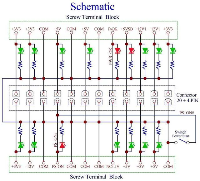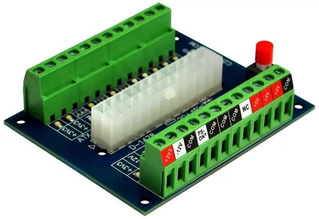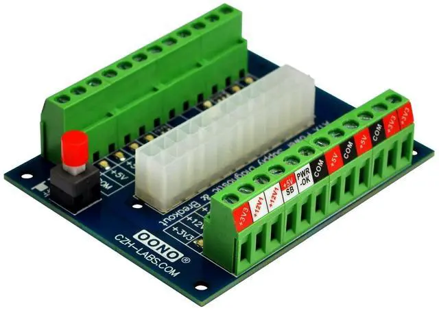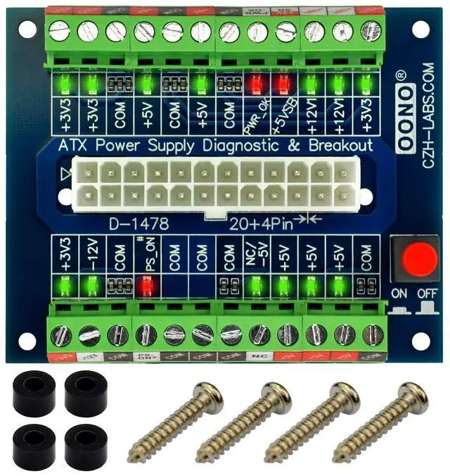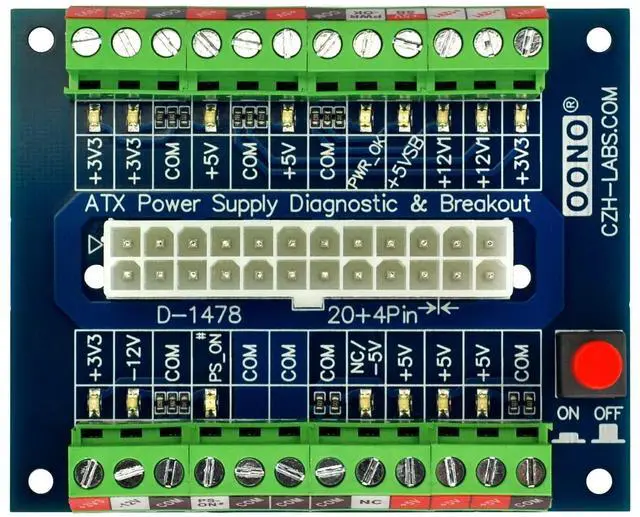 OONO 24/20-Pin ATX DC Power Supply Diagnostic/Breakout Board Module. 1, 24-pins Standard ATX Connector, support 20 / 20+4 / 24 pins wire header. With latching button switch to control ATX power supply output ON/OFF. 2, Total 16 LEDs, it is convenient for you to diagnose the functions of all pins except COM/GND, therefore, if the output of any one wire of your ATX power supply is faulty, it can be seen at a glance. 3, High quality screw terminal blocks. Each terminal position support current output maximum 10 Amp.