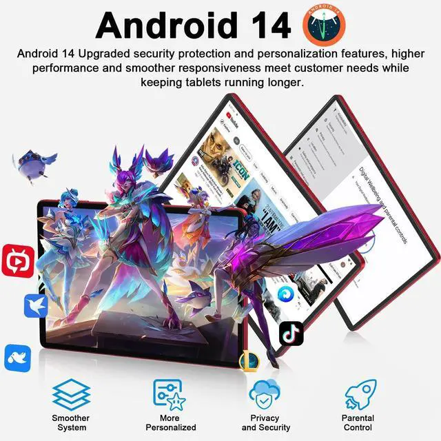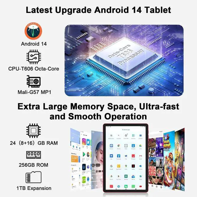 Android 14 TabletAndroid tablet with new upgraded Android 14 operating system provides higher security, faster operation, protection of personal privacy, and enhanced personalized and easy-to-use user experience. Android 14 tablet is GMS certified and you can easily access any apps in the play store. ^^ 24GB RAM+256GB ROM+1TB11 inch Android 14 tablet comes with 24GB (8GB physical memory + 16GB virtual memory) of RAM and 256GB ROM with support for up to 1TB of expandable TF cards (not included). Store tons of movies, music, eBooks, and more, and handle large apps and multitasking with ease.