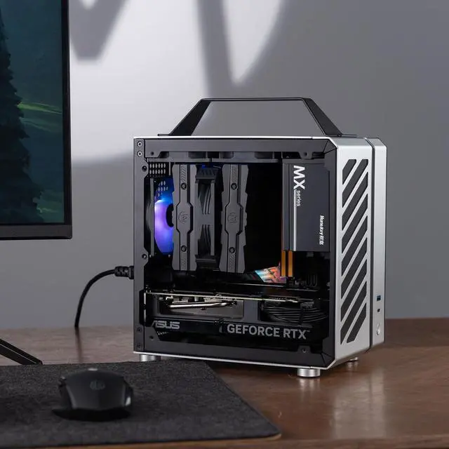 Compact & Portable 9.9L ultra-small form factor with an aluminum handle, ideal for space-saving setups and on-the-go use. ^^ Broad Compatibility Supports ITX/DTX motherboards, SFX PSUs, 135mm air/120mm liquid cooling, and GPUs like RTX 3060/4060 series. ^^