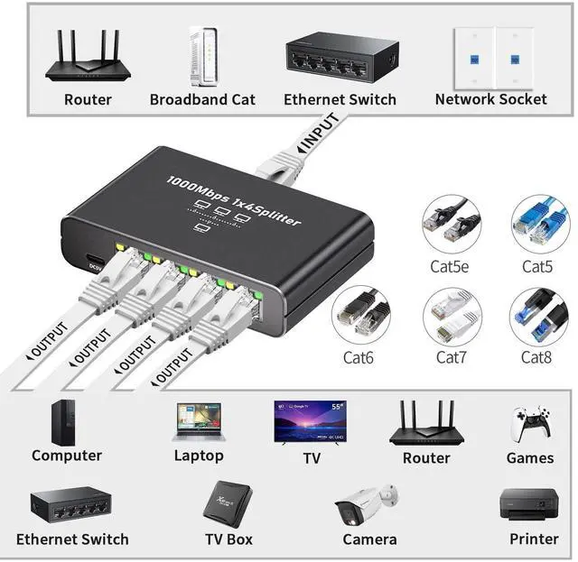 Tip: The actual network speed depends on the speed provided by your broadband provider. ^^ RJ45 Port Extender with True Plug & PlayThis 1-to-4 Internet splitter operates seamlessly when powered by the included USB-C cable. Requires zero configuration - simply connect devices and enjoy instant network expansion. The RJ45 splitter plug-and-play design eliminates complex setups, efficiently solving RJ45 port limitations for Offices, PC, Desktop, Smart TVs, Access Point devices. Easy to operate. ^^ Compatibility WidelyOur network splitter is compatible with various RJ45 cable types, including Cat5, Cat5e, Cat6, Cat7, Cat8. It can be compatible with Computer, Laptop, Starlink, Printer, ADSL, hubs, switch, TV, set-top box, router, wireless bridge etc.