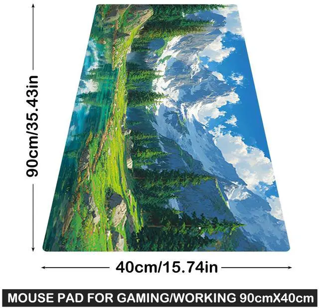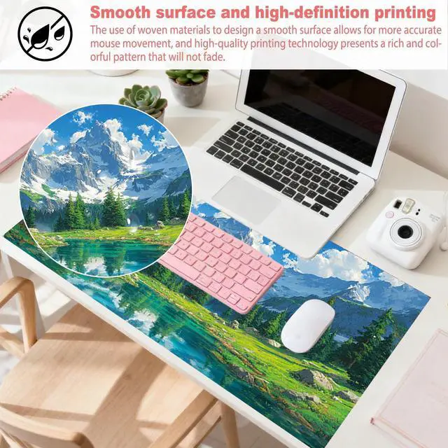 Features a fresh landscape with lake and mountains artwork, bringing a tranquil natural vibe to your workspace while providing a large, smooth surface area for better mouse movement. ^^ Large size design ( 35.4 x 15.7 x 0.1IN ) offers ample space that fits both keyboard and mouse, ideal for nature lovers or those who enjoy serene outdoor aesthetics. ^^ Long - lasting anti - fray rugged stitching surrounds the mouse pad, enhancing durability to preserve the vivid natural landscape design. ^^ Ultra - smooth surface, inspired by the calmness of the lake in the artwork, ensures exceptional tracking performance and aiming precision with optical and laser technology.