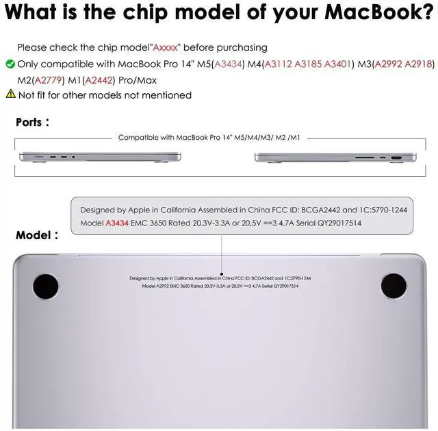 Chip Model: M5 (A3434) M4 (A3112 A3185 A3401) M3 (A2992 A2918) M2 (A2779) M1 (A2442) Pro/Max. Please check the model number "AXXXX" on the back of your Mac before purchasing. ^^ Anti rupture and anti impactTPU edges are non rigid and shatterproof, can cushion minor impacts. ^^ Scratch resistant and fingerprint resistantThe matte hard plastic surface is resistant to fingerprints and scratches. ^^ Good heat dissipationDue to many heat dissipation holes at the bottom and sides, as well as anti slip height increasing pads, heat can be fully dissipated during laptop working. ^^ Polishing cloth includedThe package contains a protective cover and a polishing cloth. Polishing cloth will be a good helper for wiping away dust and fingerprints on the screen.