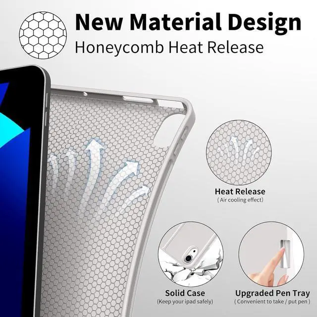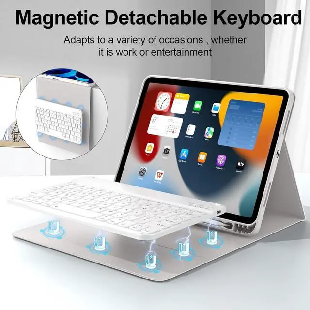 Model: A2589/A2591/A2588/A2324/A2072/A2316/A2325/A2902/A2903/A2904). NOT compatible with any other iPad models. Please check the back bottom of your iPad to find the model number before placing order. ^^ Slim Wireless Bluetooth KeyboardThe slim ( 6.2 mm) removable keyboard is attached to this iPad air keyboard magnetically (supporting Windows, IOS & Android System), let your iPad instantly become a portable laptop, perfect for working, typing, editing or watching videos, greatly improved your iPad productivity. ^^ Long Battery Life & Multi Angle Support Built-in industry-high rechargeable Li-polymer battery make the wireless keyboard of this iPad air 5th generation keyboard stand by for more than 3 days after 2-3 hours of full charge. The protective shell can be placed at different tilt angles to adjust the optimal viewing angle, very flexible and user-friendly. ^^ Buit-in Pencil Slot & Sturdy PU MaterialThe iPad air 4th generation case with keyboard has a convenient left side built-in pencil slot that easy to storage and remove your pencil (Apple Pencil is Not included). Premium PU leather cover is waterproof, scratch proof and fingerprint proof, providing full protection for your beloved tablet. ^^ Precise Cutout & Auto Sleep/Wake FunctionPrecise cutout allows full access to all ports, user interface, sensors, speakers, microphone and cameras.