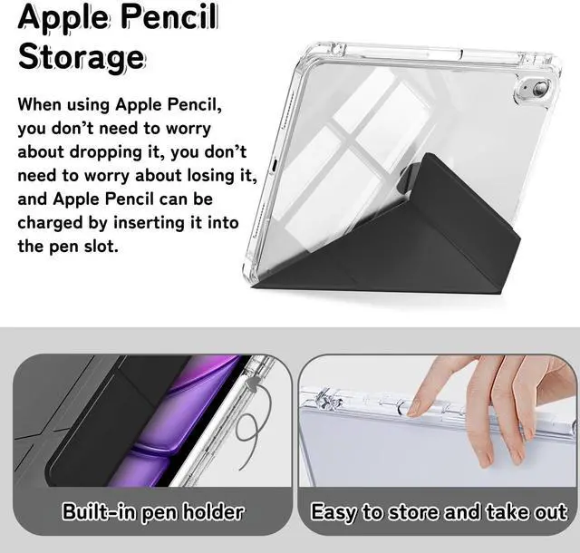 Note: Please check the model number on the back of your iPad and be sure to confirm the correct model when purchasing. ^^ Rotates Horizontally/Vertically, Stable When VerticalThe stand function supports both horizontal and vertical orientations for easy use. The excellent stability of the triangular structure prevents it from tipping over easily. It folds like origami, allowing you to choose from four angles (34, 53, 57, 62) to seamlessly and quickly switch between browsing the web, watching videos, studying, and other operations. ^^ Transparent Back CoverCase features a PU leather surface. The front cover is evenly embedded with multiple magnets, making it lightweight and portable. The inner lining of the front cover is made of microfiber material, which prevents scratches caused by friction, protects the LCD screen, and keeps it clean. The frame of the transparent back cover is made of flexible TPU for easy installation. The transparent back cover itself is made of PC material to protect the tablet from impacts. ^^ Compatible with Apple Pencil Storage and ChargingThe case for iPad Air 11 Inch 2025 / iPad Air 11 Inch 2024 is equipped with a convenient pencil holder, allowing you to use it with peace of mind without worrying about losing the pencil.