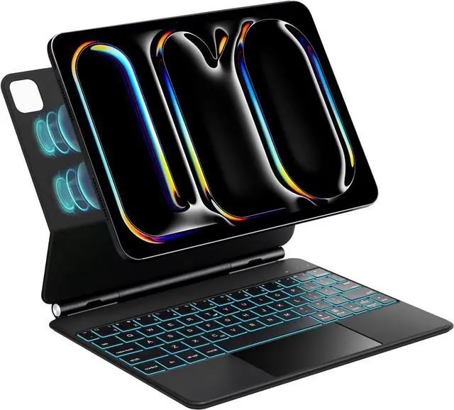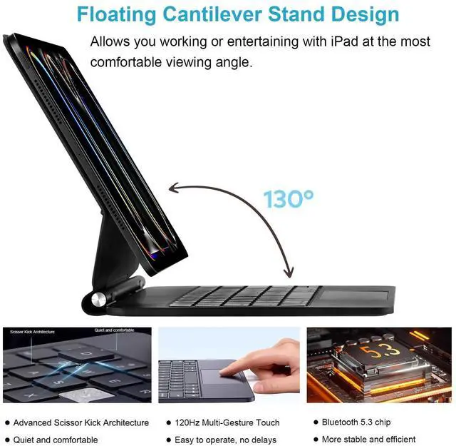 ^^ Easy-Set Magnetic Stand: You can attach your iPad to the back cover magnetically, Set the floating cantilever stand with one smooth motion, and transform your iPad turn your tablet into a highly performant and easy-to-use laptop within a second! Which is perfect for traveling, business, and school.