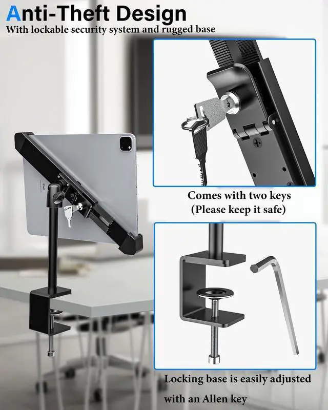 Anti-Theft SecuritySturdy and stylish ipad stand with a superior tablet security lock (with two dedicated keys) The key and lock can secure your iPad inside the tablet clip, keep your iPad safe. Anti Theft Tablet Security Stand The desktop clip installation base must be set with the included special hexagonal wrench. Tighten the screws and loosen the base to ensure the safety of the tablet (After fixing the position, please put away the key and the inner hexagon) ^^ Flexible and AdjustableThe square stand for ipad with 360 and 90 swivel features for unrivaled adjustment for typing or presentation without missing a beat.