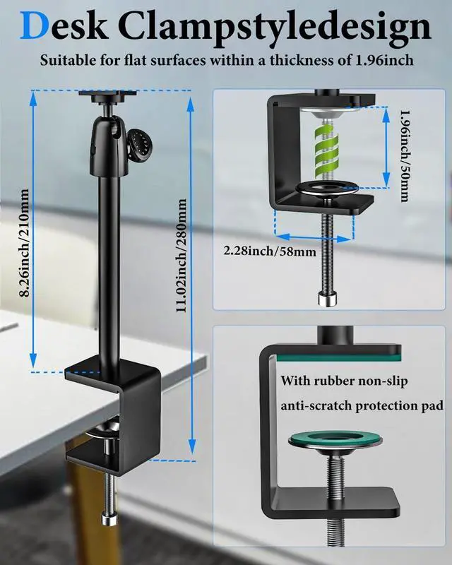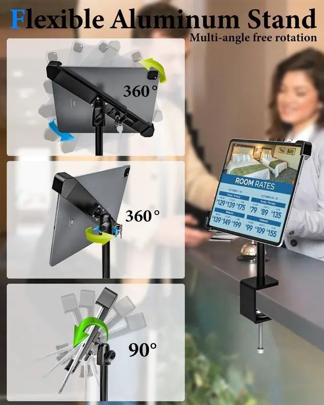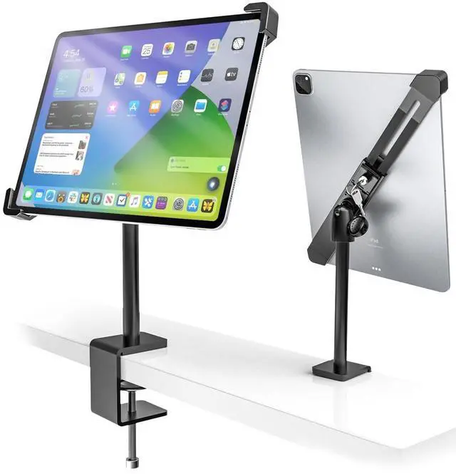 Adjustable tablet holder Switch the display between cashier and shopper in under, or switch landscape/portrait mode instantly, POS iPad stand Provide customers with better and faster product selection pages and faster checkout ^^ Easy LnstallationThis Anti-Theft iPad Kiosk Stand can be mounted in any place up to 1.96 inches, such as table, shelf, checkout counter etc. plane. The tablet stand holder can be set with the included Allen wrench and just mount the adjustable holder easily by tightening the screw lock, There is no need to drill holes to install screws to protect your desktop well, remove it without leaving traces, and install it to your desired position anytime, anywhere ^^ CompatibilityThe ipad mount for desk has an Tablet locked diagonally (to make it stronger) aluminum alloy tablet clip suitable for tablets and thick shells with a length of 220mm-320mm (thickness no more than 12mm), and is equipped with a silicone anti-scratch and anti-skid protection pad to effectively protect your tablet from being scratched.