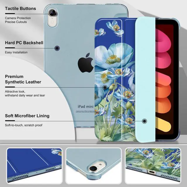 MecBevia for iPad mini 7 (A17 Pro) 8.3-inch 2024(Models A2995/A2996/A2993) / iPad mini 6 8.3-inch 2021(Models A2567/A2568/A2569), 7th/6th Gen Hard Back Case with Auto Wake/Sleep, Azure Bloom