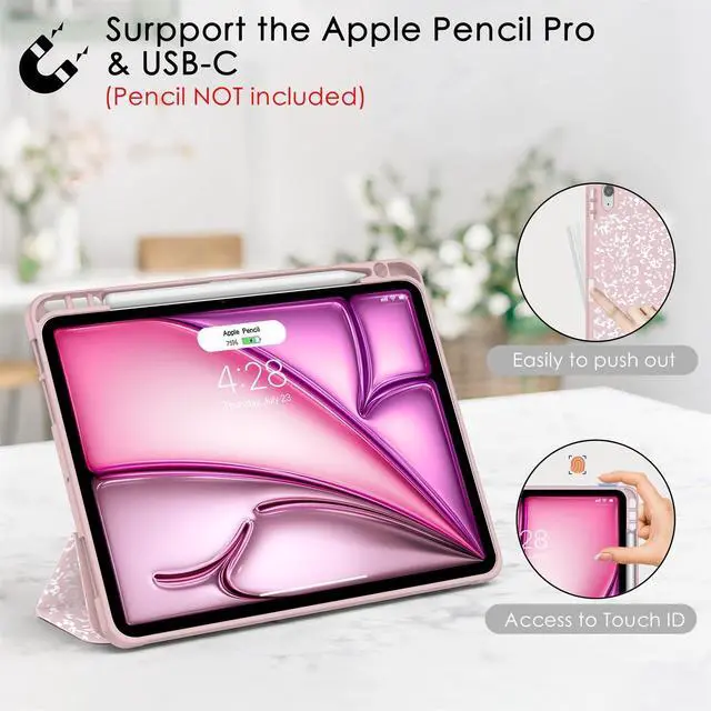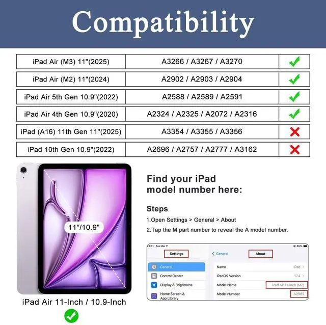 [Designed for iPad Air 11/ 10.9 inch M3 M2] - Exclusively designed for iPad Air 11 Inch M3/M2 2025-2024 (A3266 A3267 A3270; A2902 A2903 A2904), iPad Air 5th Generation 2022 (A2589 A2591 A2588), iPad Air 4th Generation 2020 (A2316 A2324 A2325 A2072) ^^ [Designed for your Apple Pencil] - Built-in pencil holder, conveniently place and remove your pencil, no longer worry about losing or breaking. Keeping your pencil for the iPad Air 11" M3 M2, iPad Air 5/4 gen safely all the time. (Pencil is Not included) ^^ [Designed for Full Protection] - This Case for iPad Air 11 inch/ iPad Air 5/4th Generation is made of durable PU leather exterior & soft microfiber lining & flexible TPU back shell provide full protection against fingerprints, shocks, bumps and scratches ^^ [Designed for Auto Sleep/Wake] - Inner magnetic strip, easy snap on and off, can ensure the auto sleep/wake function engages quickly every time.