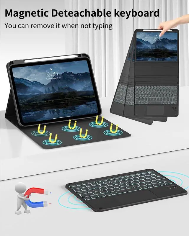 Note: It will not be compatible other model. Please check your iPad model before purchase ^^ Detachable Bluetooth KeyboardDetachable Bluetooth keyboard with magnetic case, instantly becomes a portable laptop, easy to install and remove, built-in rechargeable battery, no need to replace the battery, Type-C charging cable It can be fully charged in 2 hours, work for at least 230 hours, stand by for 90 days, making it more convenient to use ^^ Full protection & Pencil HolderThis iPad 10.9 inch case is made of high-quality synthetic leather outer shell and soft TPU inner shell, the inner shell is designed with honeycomb grid pattern for better heat dissipation and anti-slip, which can better protect your tablet from accidental drops and collision scratches. Prevent losing or breaking your Apple Pencil when you're walking or outdoor (Please note: Pencil is Not included) ^^ Multiple Viewing Angle & Auto Sleep/WakeThis Keyboard Case 10.9" adopts magnetic adsorption and can be firmly fixed on the case, so it can provide a variety of stand angles for adjustment at any time. Move iPad forward or backward along the case to choose the angle that works best for your comfort. Built-in magnetic strip, support smart automatically wakes or sleep function, easily wake or close your iPad 10th Gen at any times, it can better save tablet power and extend its service life ^^ Package Content & After-sales ServicePackage including: 1 x 10th Gen ipad case, 1 x Wireless BT Keyboard, 1x USB charging cord, 1 x user guide. Provide 30 days return and exchange service. If you have any questions, please contact us by email